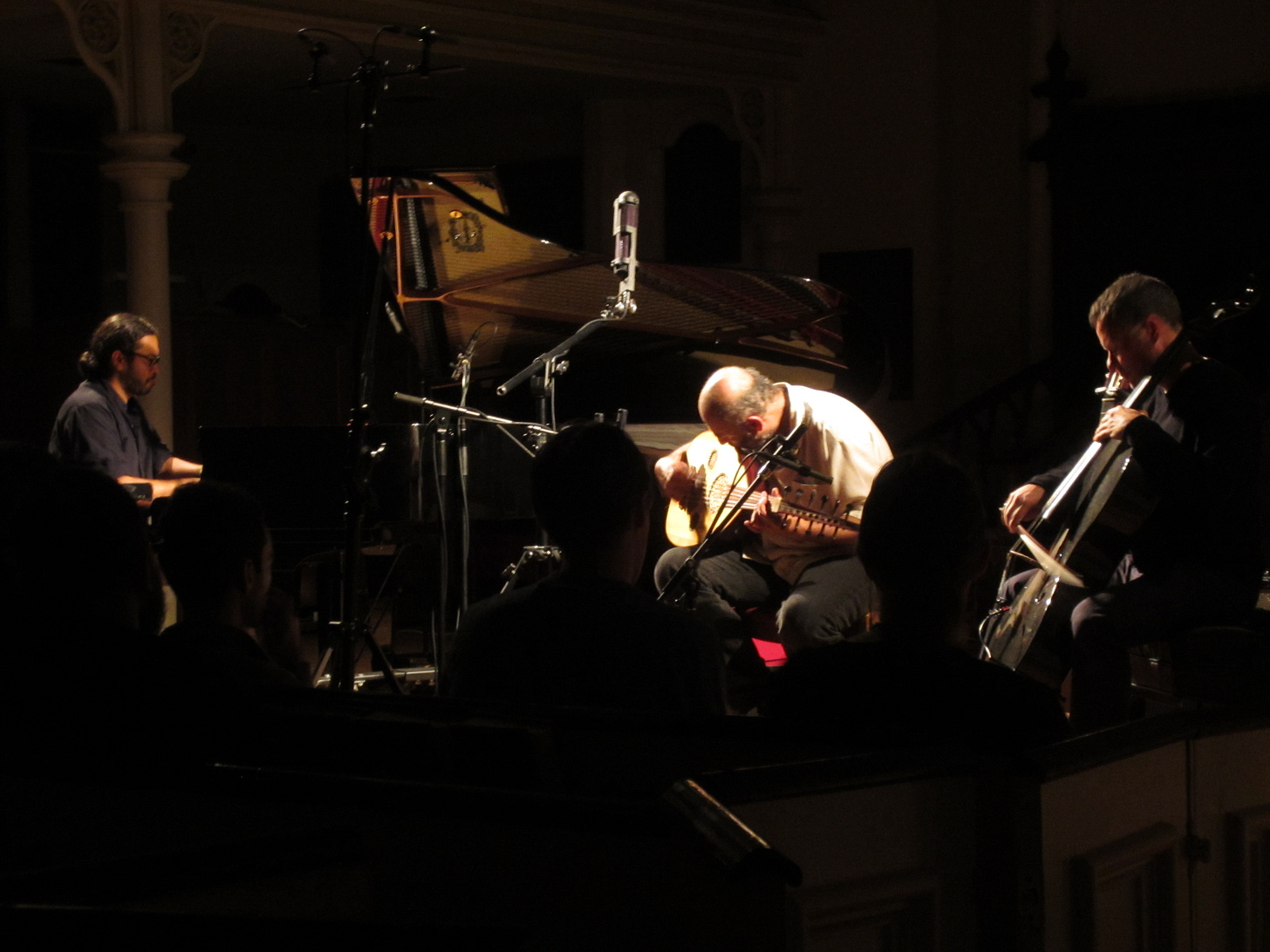 That's something for me that for me started I guess around the time that I started playing oud and then I started to become interested in microtonality and learning about just intonation and whatever, you know the five limit tuning, seven limit, all those kind of things that like people like Partch or Ben Johnston... and you know in this trio, one of the cool things is everyone's open to that. I don't feel like I'm pushing anybody in that direction and I certainly know that they don't feel like they're being pushed in any particular direction. There's a kind of naturalness to it that's satisfying in that respect. It's not heavy-handed. We're not doing microtonal music, but it's sort of integrated into what we do.